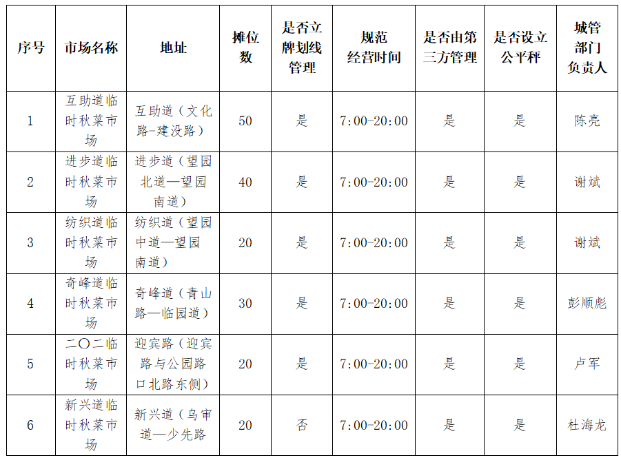 (一)秋菜临时市场开放时间:2025年10月15日—11月15日,经营时间:早7:00至晚20:00,每个市场内设置公平称,方便市民监督。环境卫生方面:由市场管理方专人管理,保证规范管理、垃圾日产日清、市场卫生整洁。