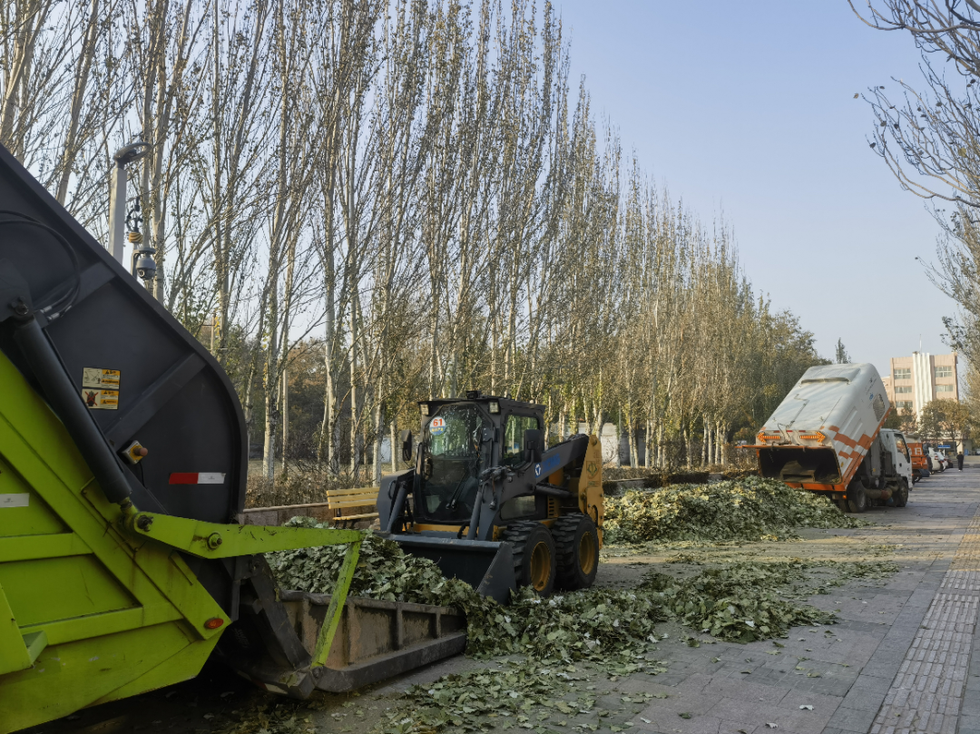 为提升清扫效率,机械化清扫一公司优化作业模式,采用 “人工精细清扫+机械高效作业” 的协同方式,实现落叶清扫 “无死角、全覆盖”。人工清扫队伍利用便携式吹风机、扫帚,重点对人行道、绿化带边缘、树坑等机械作业难以覆盖的区域进行精细化清扫,让散落的落叶集中等待机械收集;改装的吸叶车、小型清扫车沿着民族东路来回穿梭,对路边归置的落叶进行吸扫作业;在落叶集中堆放点,装载机替代传统人工铲装,将落叶批量转运至压缩清运车,形成了 “机械扫主干、人工打辅助、车辆快转运” 的高效作业闭环,日均处置落叶量突破10吨。