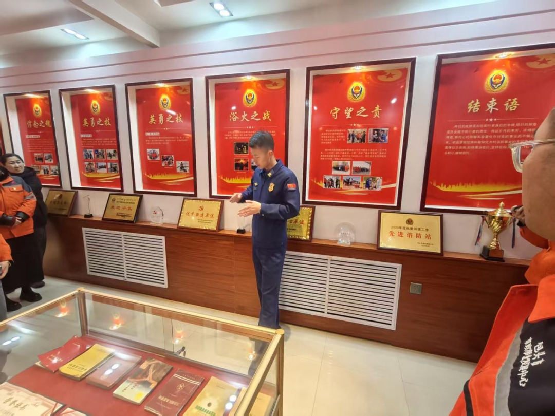 随后,大家先后参观了消防救援站的宿舍内务与荣誉室。走进宿舍,整齐划一的被褥、规范有序的物品摆放、干净整洁的居住环境,充分展现了消防队伍严谨细致的作风纪律,中心工作人员纷纷表示深受触动、值得学习;在荣誉室,一幅幅珍贵照片、一面面沉甸甸的锦旗、一个个闪耀的奖杯,生动再现了消防救援队伍在抢险救灾、应急处置等工作中的英勇事迹与光荣历程,让在场人员深刻感悟到消防救援人员忠诚担当、无私奉献的职业精神。
