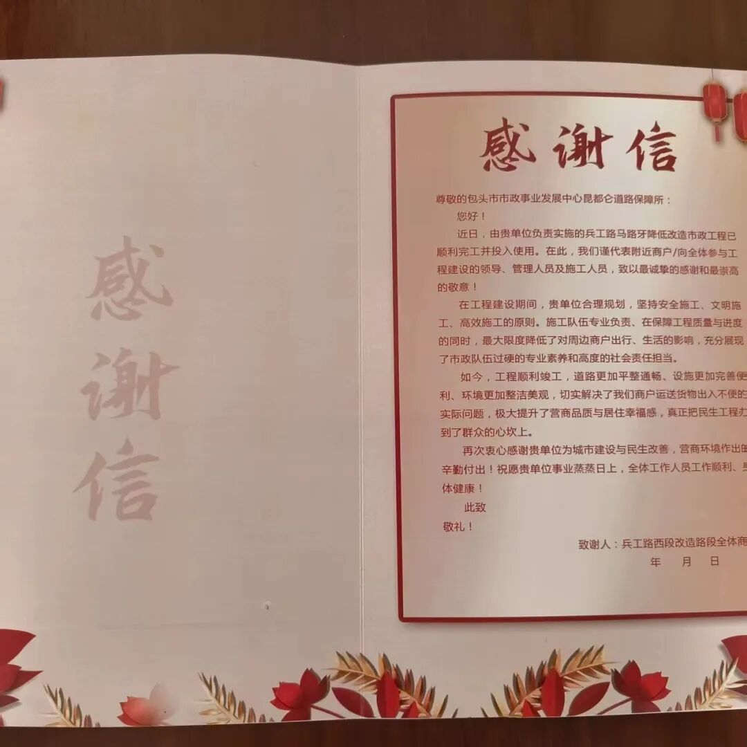 近日,边墙壕村村民委员会、兵工路周边商铺代表及市民专程送来锦旗和感谢信,点赞市政事业发展中心昆都仑道路保障所高效处置道路隐患的务实作风。