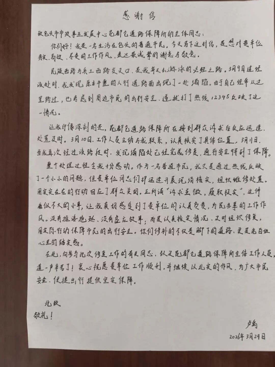 信致谢 旗传情|市政事业发展中心昆都仑道路保障所用心破解群众出行难题