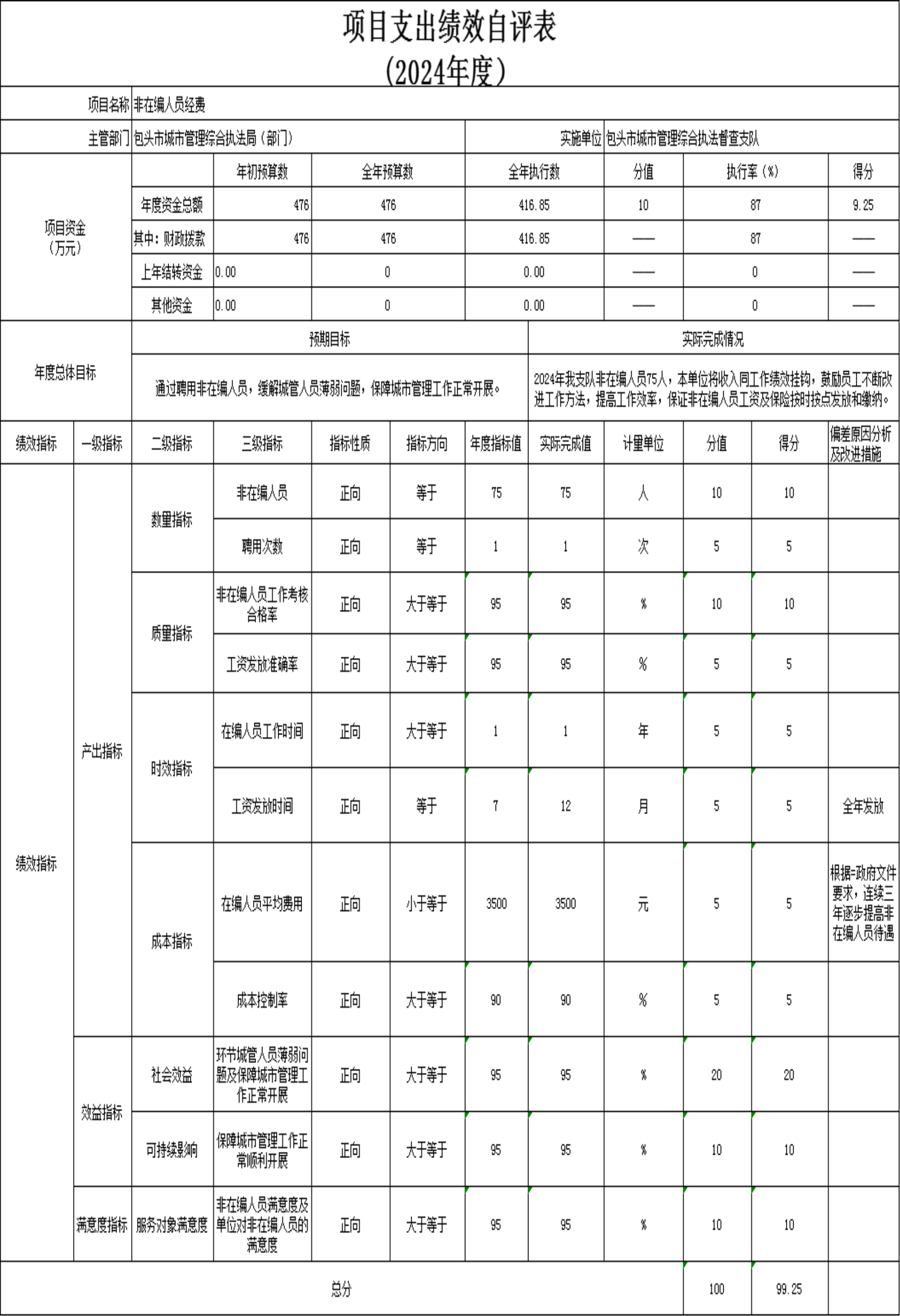 非在编人员经费项目自评综述:根据年初设定的绩效目标,项目自评得分90分。全年预算数为476万元,执行数416.85万元,完成预算的87%。项目绩效目标完成情况:2024年全年发放及缴纳非在编人员工资及社保416.85万元,及时全额发放及缴纳。由于非在编人员工资水平较低,下一步争取逐步提高非在编人员工资待遇。