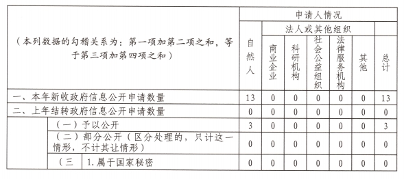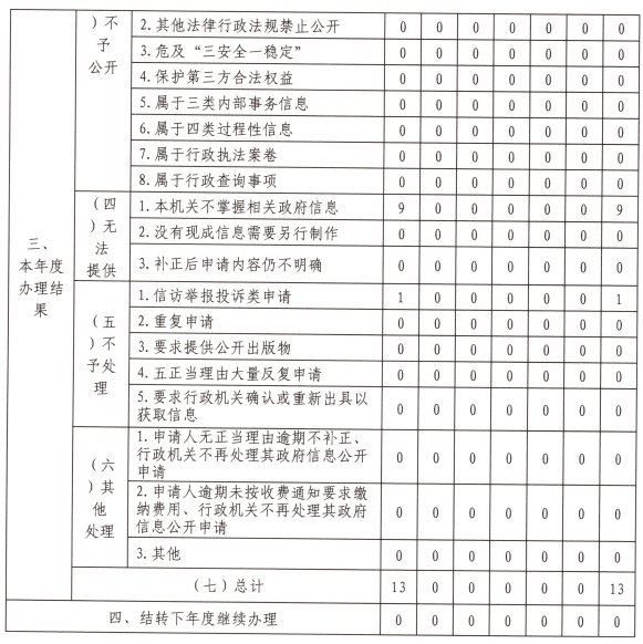 2024年度收到依申请公开信息13项,不属于本机关掌握信息事项9项,可以公开信息事项3项,已按要求进行答复,不作为政府信息公开申请处理1项。